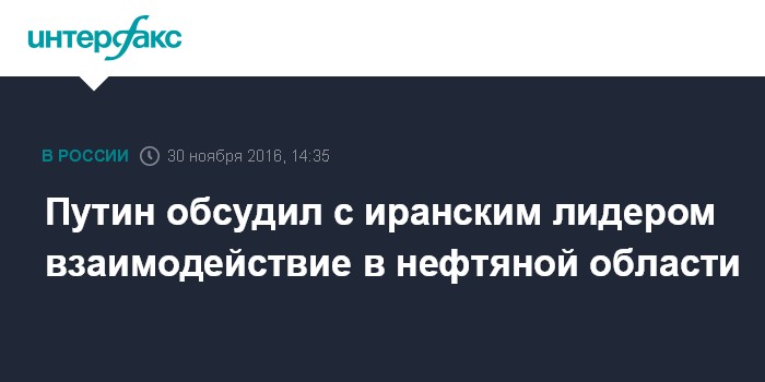 Москва. 30 ноября. INTERFAX.RU - Президенты России и Ирана Владимир Путин и Хасан Рухани обсудили в ходе телефонного разговора вопросы взаимодействия в нефтяной сфере, сообщил пресс-секретарь президента РФ Дмитрий Песков.