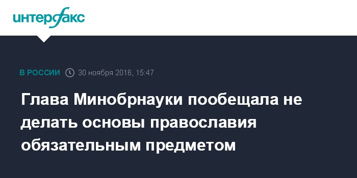 Москва. 30 ноября. INTERFAX.RU - Школьный курс основ православия и духовной культуры направлен на доработку, программа будет лишь факультативной, заявила глава Минобрнауки Ольга Васильева.