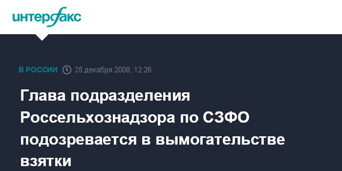 Москва. 25 декабря. INTERFAX.RU - Ряд должностных лиц, включая руководителя подразделения Россельхознадзора по СЗФО, подозреваются в вымогательстве взятки в сумме 20 млн руб., сообщил начальник департамента экономической безопасности (ДЭБ) МВД России Юрий Шалаков в четверг.