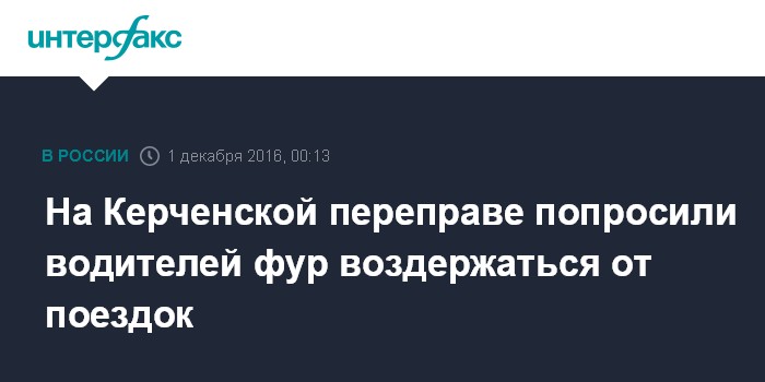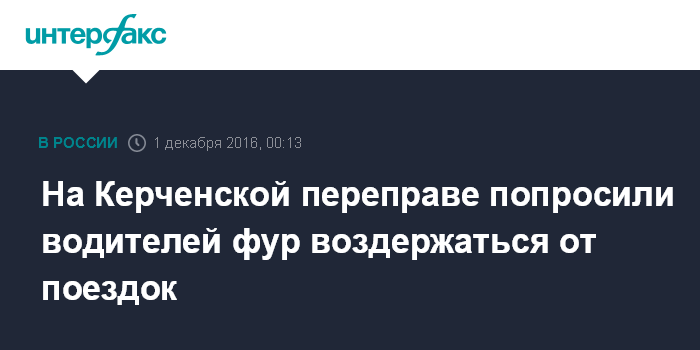 Москва. 1 декабря. INTERFAX.RU - Керченская паромная переправа, одна из основных транспортных артерий между Крымом и остальной частью России, просит водителей фур воздержаться от поездок.