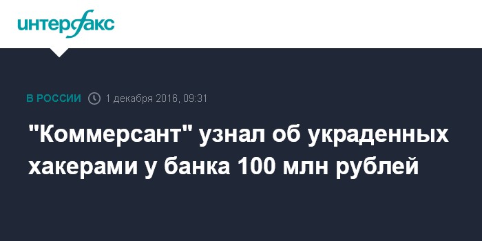 "Коммерсант" узнал об украденных хакерами у банка 100 млн рублей