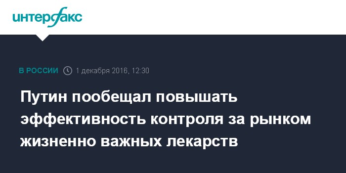 Москва. 1 декабря. INTERFAX.RU - Президент РФ Владимир Путин пообещал существенно повысить эффективность контроля за рынком жизненно важных лекарственных средств.
