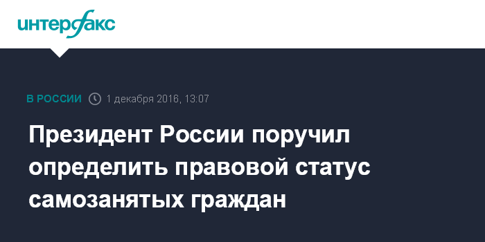 Москва. 1 декабря. INTERFAX.RU - Президент России Владимир Путин напомнил, что по действующем законодательству деятельность самозанятых граждан все еще может трактоваться как незаконная предпринимательская деятельность. В связи с этим он поручил в течение 2017 года четко определить правовой статус самозанятых граждан.