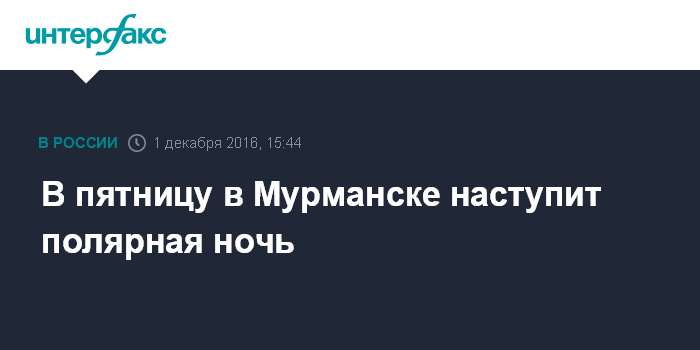 Москва. 1 декабря. INTERFAX.RU - Полярная ночь, в период которой солнце не поднимается выше линии горизонта, наступит на широте Мурманска в пятницу, сообщили "Интерфаксу" в региональном Гидрометцентре.