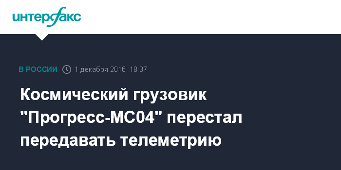 "Сообщаем, что сегодня после пуска ракеты-носителя "Союз-У" с транспортным грузовым кораблем "Прогресс МС-04" с 383-й секунды пропала телеметрия. В настоящее время специалисты "Роскосмоса" выясняют ситуацию", - говорится в сообщении, поступившем в "Интерфакс".