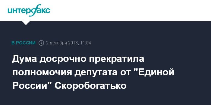 Москва. 2 декабря. INTERFAX.RU - Госдума в пятницу досрочно прекратила депутатские полномочия одного из богатейших депутатов Александра Скоробогатько ("Единая Россия").