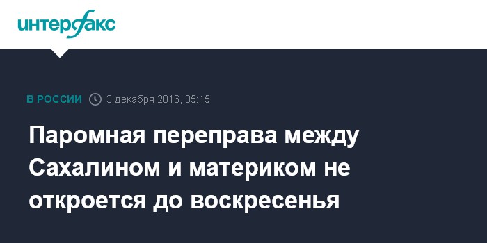 Москва. 3 декабря. INTERFAX.RU - Паромная переправа Ванино-Холмск, связывающая остров Сахалин с материком, вторые сутки закрыта из-за циклона. Ориентировочно она откроется в воскресенье, сообщила в субботу пресс-служба Дальневосточного регионального центра МЧС.