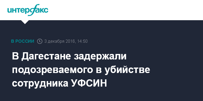 Москва. 3 декабря. INTERFAX.RU - Сотрудники полиции по Дагестану задержали подозреваемого в убийстве сотрудника УФСИН, совершенного накануне в Махачкале, сообщила в субботу "Интерфаксу" представитель МВД России Ирина Волк.