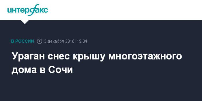 Москва. 3 декабря. INTERFAX.RU - Ураганный ветер в Центральном районе Сочи снес часть крыши многоэтажного дома, спасатели ликвидируют последствия инцидента, сообщили "Интерфаксу" в пресс-службе администрации Сочи в субботу.