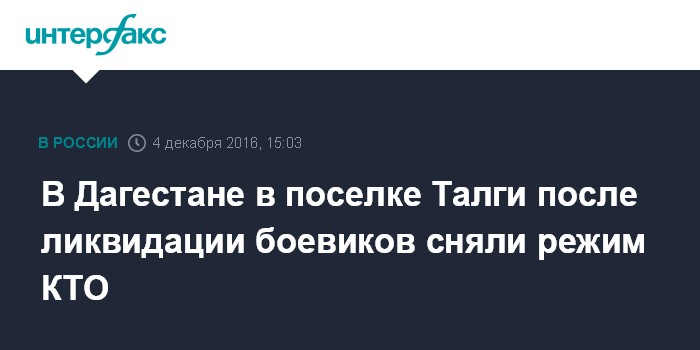 Москва. 4 декабря. INTERFAX.RU - Силовики завершили спецмероприятия в пригородном поселке Талги города Махакалы (Дагестан), режим КТО снят, сообщил "Интерфаксу" представитель оперативного штаба Национального антитеррористического комитета (НАК) республики.
