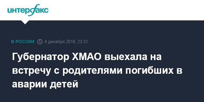 Москва. 4 декабря. INTERFAX.RU - Губернатор Ханты-Мансийского автономного округа Наталья Комарова выехала в гостиницу, где находятся родители пострадавших и погибших в дорожной аварии с участием автобуса, сообщила директор департамента общественных и внешних связей правительства ХМАО Елена Шумакова.