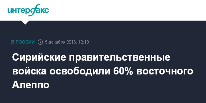 Москва. 5 декабря. INTERFAX.RU - Сирийская армия при поддержке народного ополчения освободила 60% восточной части Алеппо, которую удерживали боевики, сообщило арабское издание "Аль-Масдар".