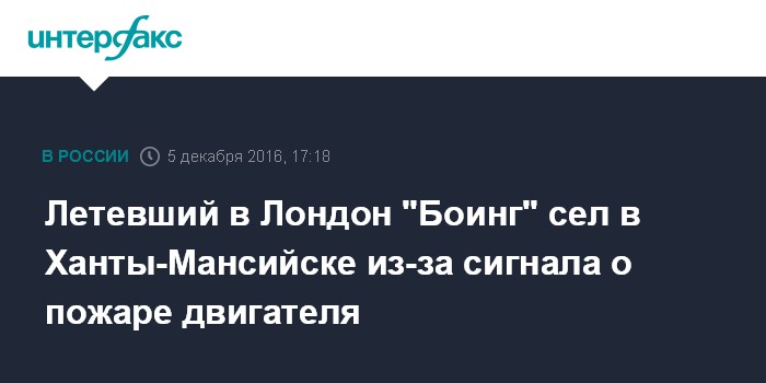 Москва. 5 декабря. INTERFAX.RU - Дальнемагистральный "Боинг" южнокорейской авиакомпании, направлявшийся в Лондон, у которого сработала сигнализация о пожаре двигателя, экстренно сел в Ханты-Мансийске, сообщили агентству "Интерфакс" в пресс-службе ГУ МЧС по ХМАО.