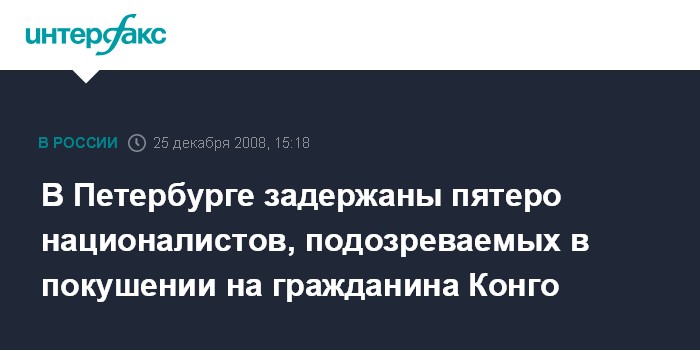 Москва. 25 декабря. INTERFAX.RU - Центр по борьбе с экстремизмом ГУВД Петербурга и Ленинградской области задержал пятерых молодых людей, подозреваемых в нападении на гражданина Конго в ноябре 2007 г., сообщил "Интерфаксу" в четверг источник в правоохранительных органах города.