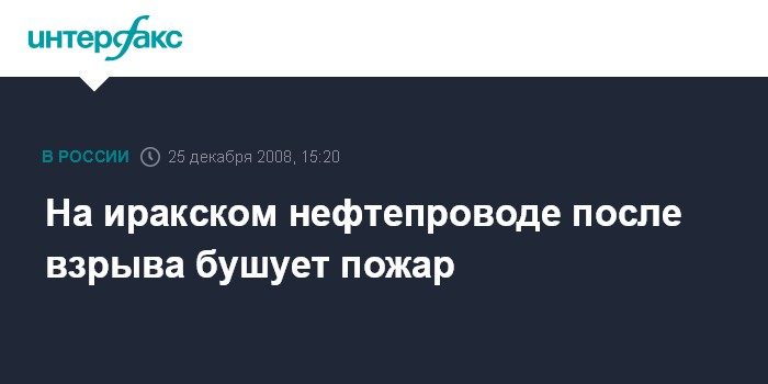 Москва. 25 декабря. INTERFAX.RU - После взрыва бомбы на нефтепроводе в районе иракского города Киркука начался пожар, сообщает в четверг совместный иракско-американский военный координационный центр в Киркуке. По его данным, взрыв прогремел в ночь на четверг.