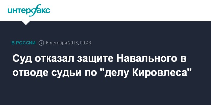 Москва. 6 декабря. INTERFAX.RU - Ленинский суд Кирова во вторник отказал в отводе судьи Алексея Втюрина по ходатайству защиты оппозиционера Алексея Навального и предпринимателя Петра Офицерова, обвиняемых в хищении у предприятия "Кировлес".