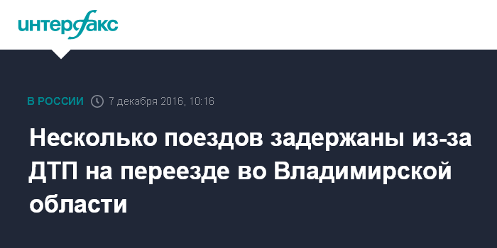 Москва. 7 декабря. INTERFAX.RU - На переезде во Владимирской области задержаны пассажирские поезда №109 сообщением Новый Уренгой - Москва - на 51 минуту, №83 сообщением Приобье - Москва - на 48 минут, №4 сообщением Москва - Пекин - на 25 минут.