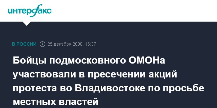 По его словам, "усиление - это обычная практика". "Руководство региона посчитало необходимым привлечь дополнительные силы, и ему такая помощь была оказана. Никто в Москве им ничего не навязывал", - пояснил источник. Он сообщил, что "бойцы отряда ОМОН "Зубр" выезжали во Владивосток в количестве до 100 человек".