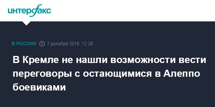 Москва. 7 декабря. INTERFAX.RU - В Кремле отмечают, что в восточной части сирийского Алеппо вести переговоры о перемирии не с кем, там остались только террористы.