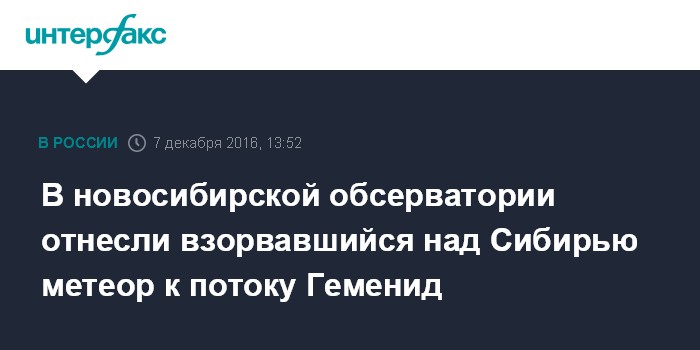 Москва. 7 декабря. INTERFAX.RU - Метеор, пролетевший во вторник над Саянами, скорее всего, являлся "представителем" потока Геменид, который наблюдается в декабре с максимумом в ночь на 14 декабря. Об этом сообщили агентству "Интерфакс" в обсерватории Новосибирского государственного университета.