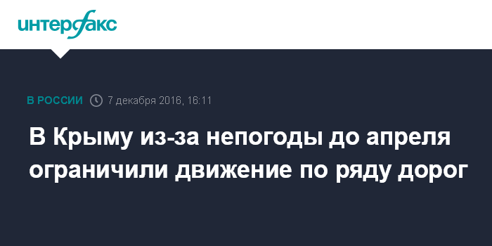 Москва. 7 декабря. INTERFAX.RU - Министерство транспорта Крыма ограничило движение автомобилей по ряду дорог до апреля следующего года во избежание аварий из-за непогоды, сообщила пресс-служба ведомства.