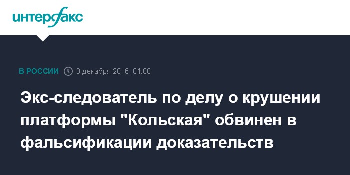 Москва. 8 декабря. INTERFAX.RU - Бывший следователь по особо важным делам Дальневосточного следственного управления на транспорте (ДВСУТ) СКР Виталий Фердер стал фигурантом уголовного дела о фальсификации доказательств в деле о крушении плавучей буровой "Кольская" (судовладелец ОАО "Арктикморнефтегазразведка", АМНГР) в Охотском море в декабре 2011 года.
