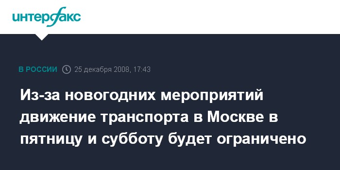 Москва. 25 декабря. INTERFAX.RU - В центре Москвы в пятницу и субботу во время проведения новогодних мероприятий будет ограничено движение транспорта, сообщил журналистам начальник ГИБДД столицы Сергей Казанцев.