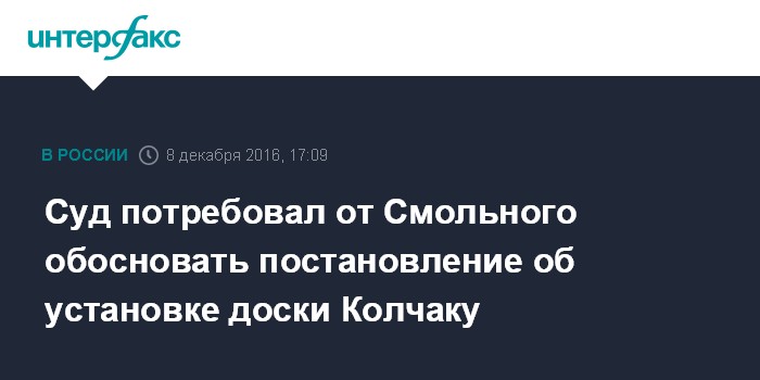 Москва. 8 декабря. INTERFAX.RU - Смольнинский районный суд потребовал от правительства Петербурга предоставить документы, ставшие основанием для издания акта об установке доски белому адмиралу Александру Колчаку.