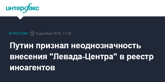 Москва. 8 декабря. INTERFAX.RU - Президент РФ Владимир Путин согласился с неоднозначностью решения о внесении негосударственной исследовательской организации "Левада-Центр" в реестр иностранных агентов.