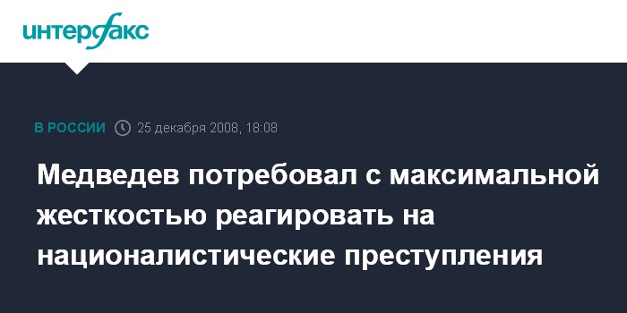 Москва. 25 декабря. INTERFAX.RU - Президент России Дмитрий Медведев поручил ФСБ максимально жестко реагировать на преступления на националистической почве.