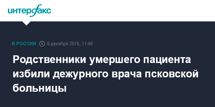 Москва. 9 декабря. INTERFAX.RU - В Псковской областной больнице родственники больного, скончавшегося от рака, напали на медиков, сообщили "Интерфаксу" в пресс-службе УМВД России по Псковской области.