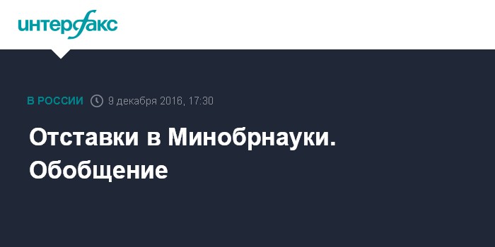 Москва. 9 декабря. INTERFAX.RU - Сразу несколько заметных отставок объявлены в структуре руководства Минобрнауки РФ за последние две недели: освобождены от должности два заместителя министра Ольги Васильевой и два руководителя департаментов, причем один вместе с тремя своими заместителями.