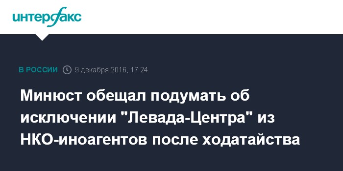 Москва. 9 декабря. INTERFAX.RU - Министерство юстиции готово рассмотреть вопрос об исключении аналитического центра Юрия Левады из реестра НКО-иноагентов, если представители организации обратятся с соответствующим ходатайством, сообщили в пресс-службе ведомства.