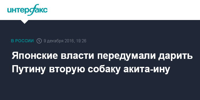 Москва. 9 декабря. INTERFAX.RU - Японские власти отказались от планов подарить президенту России Владимиру Путину еще одну собаку породы акита-ину, сообщает в пятницу японская газета "Санкэй симбун".
