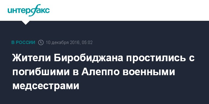 Москва. 10 декабря. INTERFAX.RU - Церемония прощания с двумя погибшими в сирийском Алеппо военными медсестрами проходит в субботу в Благовещенском кафедральном соборе Биробиджана.