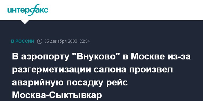 Москва.25 декабря. ИНТЕРФАКС-МОСКВА - В аэропорту "Внуково" в Москве из-за разгерметизации салона произвел аварийную посадку рейс Москва-Сыктывкар.