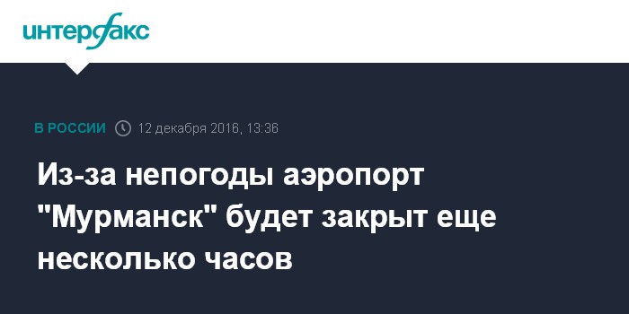 Москва. 12 декабря. INTERFAX.RU - Принято решение о продлении закрытия аэропорта "Мурманск" из-за непогоды, сообщили в понедельник "Интерфаксу" в координационно-диспетчерской службе воздушной гавани.