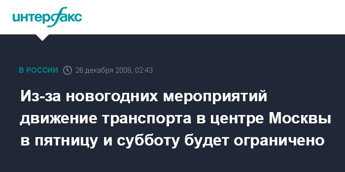 Москва. 26 декабря. ИНТЕРФАКС-МОСКВА - В центре Москвы в пятницу и субботу во время проведения новогодних мероприятий будет ограничено движение транспорта, сообщил журналистам начальник ГИБДД столицы Сергей Казанцев.