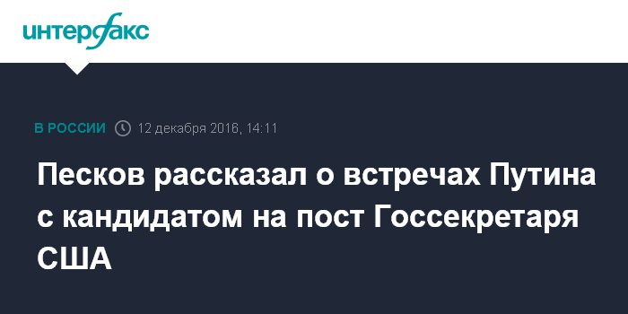 "У них были деловые встречи. Действительно, президент (Владимир Путин) несколько раз принимал господина Тиллерсона, в том числе вместе с его тогдашними партнерами в РФ", - заявил пресс-секретарь президента РФ Дмитрий Песков, отвечая на вопрос, знаком ли российский лидер с известным предпринимателем, которого прочат на должность госсекретаря США.