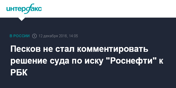 Москва. 12 декабря. INTERFAX.RU - В Кремле воздержались от комментариев в связи с судебным решением по иску "Роснефти" к РБК.