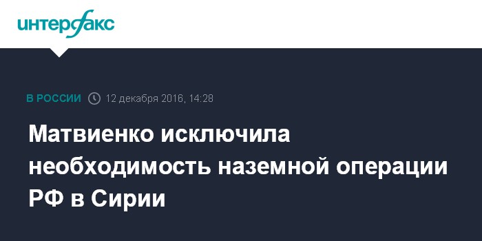Москва. 12 декабря. INTERFAX.RU - Никакой речи об участии российских войск в наземной операции в Сирии не идет, заявила журналистам председатель Совета Федерации Валентина Матвиенко в Абу-Даби, отвечая на вопрос "Интерфакса".