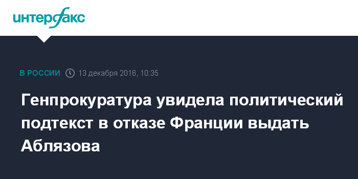 Москва. 13 декабря. INTERFAX.RU - Генеральная прокуратура России считает необоснованным и противоречащим нормам международного права решение Госсовета Франции об отказе в выдаче экс-министра Казахстана, предпринимателя Мухтара Аблязова, на экстрадиции которого уже несколько лет настаивала российская сторона.