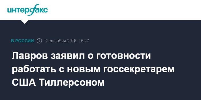 Москва. 13 декабря. INTERFAX.RU - В Москве принимают назначение председателя совета директоров и CEO нефтяной компании Exxon Mobil Рекса Тиллерсона на пост госсекретаря США в новой администрации и готовы с ним работать, заявил глава МИД РФ Сергей Лавров.