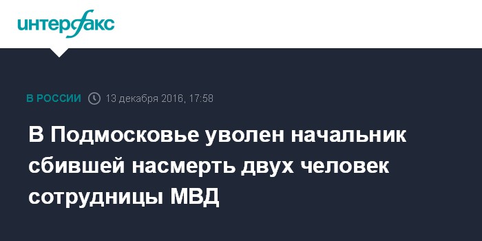 Москва. 13 декабря. INTERFAX.RU - Начальник сотрудницы полиции, которая, находясь за рулем в состоянии опьянения, сбила насмерть двух пешеходов в Подмосковье, уволен.