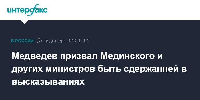 Москва. 15 декабря. INTERFAX.RU - Премьер РФ Дмитрий Медведев, комментируя ряд высказываний главы Минкультуры Владимира Мединского, призвал всех министров быть "аккуратными и сдержанными" в своих заявлениях, в противном случае их слова могут быть восприняты как окрик со стороны государства.