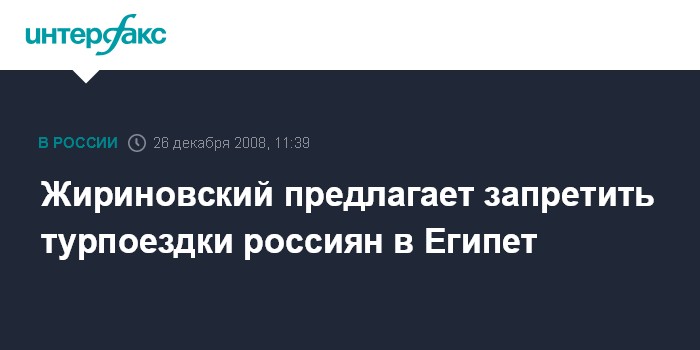 Москва. 26 декабря. INTERFAX.RU - Вице-спикер Государственной Думы, лидер ЛДПР Владимир Жириновский предложил коллегам по палате инициировать вопрос о полном запрете туристических поездок в Египет.