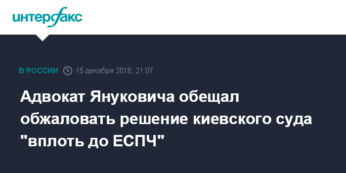 Москва. 15 декабря. INTERFAX.RU - Адвокат экс-президента Украины Виктора Януковича Виталий Сердюк сообщил, что решение Печерского районного суда Киева, который поддержал ходатайство прокурора о разрешении на задержание его клиента, будет обжаловано во всех соответствующих судах, вплоть до Европейского суда по правам человека (ЕСПЧ).