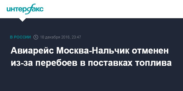 Москва. 18 декабря. INTERFAX.RU - Неисполнение обязательств поставщиком авиатоплива в Нальчике стало причиной отмены рейса авиакомпании "Победа" по маршруту Москва-Нальчик-Москва в понедельник, сообщили агентству "Интерфакс" в международном аэропорте "Нальчик" в воскресенье.