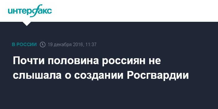 Москва. 19 декабря. INTERFAX.RU - Чуть менее половины россиян оказались не в курсе создания Росгвардии, сообщил гендиректор ВЦИОМ Валерий Федоров.