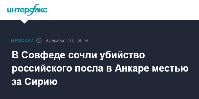 Москва. 19 декабря. INTERFAX.RU - За убийством российского посла в Турции стоят радикальные исламисты, которые мстят за действия РФ в Сирии, заявил первый заместитель председателя Комитета Совета Федерации по обороне и безопасности Франц Клинцевич.
